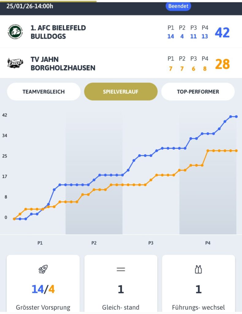 Dass das Spiel extrem punktearm verlief, lag einerseits an der guten Verteidigungsarbeit – Vicky Pieper setzte den gegnerischen Aufbau permanent unter Druck, unter dem Korb spielte Molly Roberts wieder einmal ihre physische Überlegenheit aus, sodass die Gegnerinnen ihre Ausbeute auch in der zweiten Halbzeit nicht erhöhen konnten – andererseits an einer schlechten Bulldogs-Chancenverwertung. Die verbesserte sich jedoch nach der Pause, sodass in der zweiten Hälfte immerhin 24 Zähler heraussprangen. Acht davon wurden gleich zu Beginn des 3. Viertels in Folge erzielt, was einen beruhigenden Zehn-Punkte-Vorsprung bedeutete. Der wurde im Schlussabschnitt zunächst auf 13 ausgebaut. Doch Borgholzhausen kam fünf Minuten vor dem Spielende noch einmal auf sieben heran (35:28), ehe unser Team weitere sieben Punkte zum 42:28-Endstand draufpackte.
