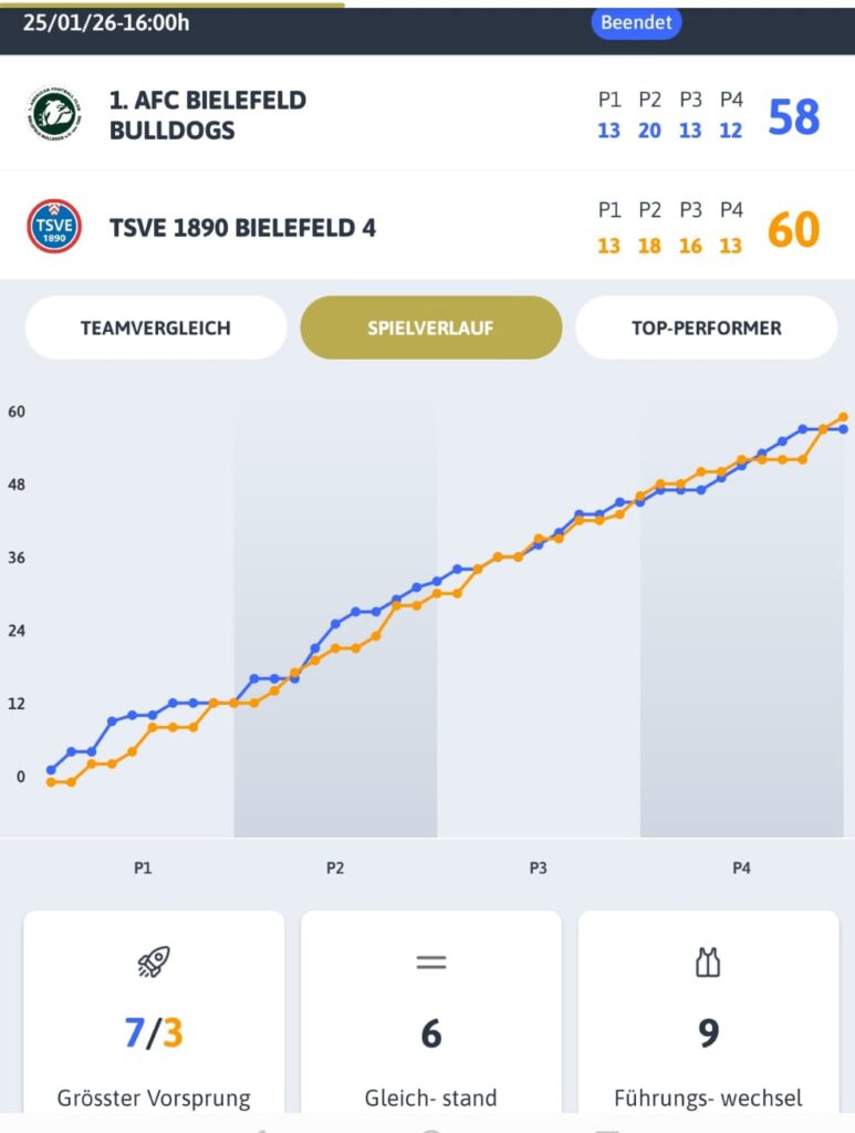 Für die Herren wurde es ohne den nach seiner Verletzung weiterhin nur coachenden Ben Stratton sowie Precious Ogugua, Max Ferber, Daniel Barrio und die Langzeitverletzten Simon Strathoff, Tresor Lath und Paul Dressler das erwartet schwere Spiel. Sie hatten zwar den etwas besseren Start, doch das 10:3 war bereits die höchste Führung; sie konnten sich nie entscheidend absetzen. Bei den alten Rivalen, die in dieser Saison nominell nur noch als 4. Mannschaft der TSVE Dolphins antreten, sich aber auch in veränderter Zusammensetzung präsentieren, taten sich die neuen Gesichter hervor, unter anderem wieder einmal als Dreierschützen. So gingen sie selbst mehrfach in Führung, doch nie mit mehr als drei Punkten. Unser Team lag zwischenzeitlich noch zweimal um sechs Punkte vorne, schließlich zwei Minuten vor Schluss mit fünf, doch dann folgten drei Ballverluste, die vom TSVE in Person von Marcel Neumann gnadenlos bestraft wurden: Drei Körbe, darunter ein Dreier, bedeuteten sieben Punkte und eine 60:58-Führung.